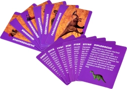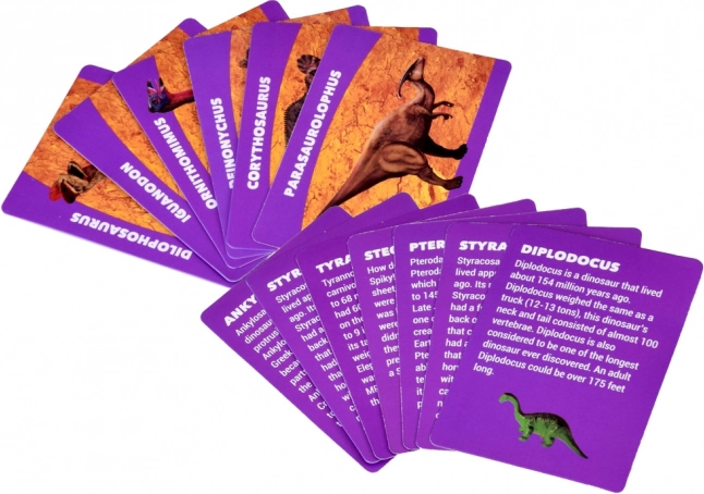 - Educatieve kaarten met dinosaurussen zoals T. rex, Stegosaurus en Diplodocus
