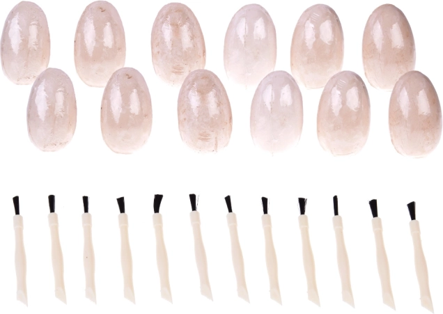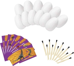 - 12 gipsen eieren, 12 dinosaurusfiguren (in de eieren), 12 kwastjes, opgraafgereedschap, 12 informatiekaarten (EN)