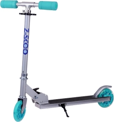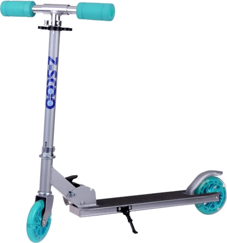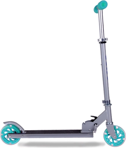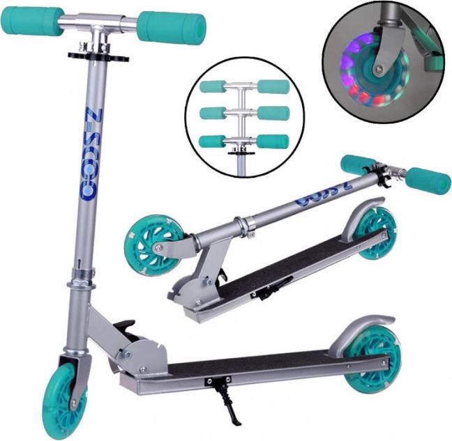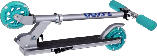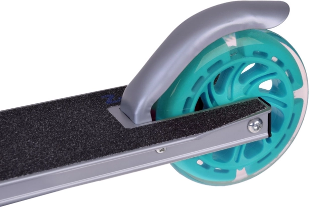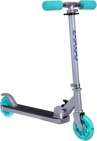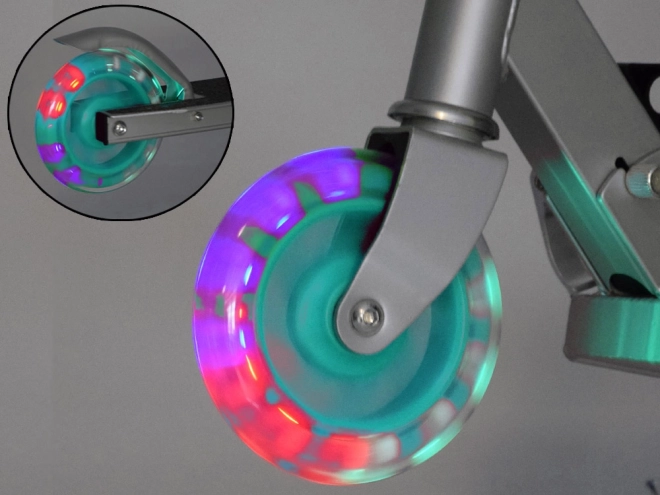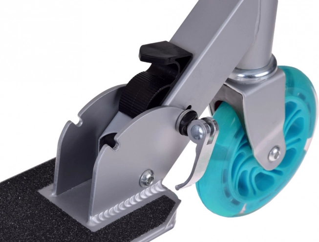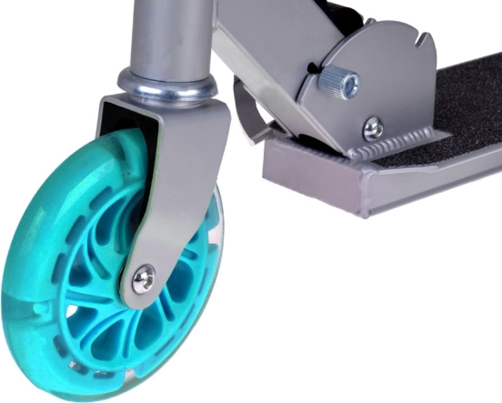Deze opvouwbare kinderstep combineert laag gewicht, een stevig metalen frame en een speels design met turkooizen accenten. Dankzij de LED-wielen die tijdens het rijden oplichten en geen batterijen vereisen, is je kind beter zichtbaar en is elke rit leuker.