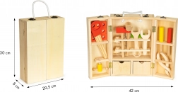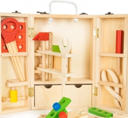 De kist bevat speciale compartimenten en een uitklapbare wand met houders voor gereedschappen, wat zorgt voor gemakkelijke toegang en orde. Met de grote verscheidenheid aan onderdelen kan uw kind eenvoudige constructies bouwen en zijn vaardigheden verbeteren op gebieden zoals schrijven, tekenen of zich aankleden.