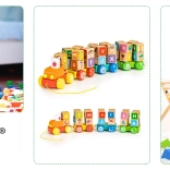 De trein bevat 26 houten blokken met hoofd- en kleine letters van het alfabet en verschillende afbeeldingen. Kinderen kunnen met de blokken eenvoudige woorden vormen, torens bouwen of ze op de wagons plaatsen; wanneer de trein rijdt, beginnen de blokken om hun as te draaien, wat zeker de aandacht van elk kind trekt.