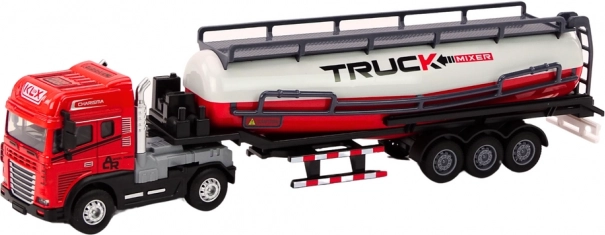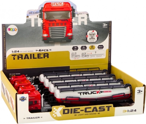 Realistisch model van een vrachtwagen met tank in schaal 1:24 dat zowel jonge chauffeurs als verzamelaars zal bekoren. Biedt licht- en geluidseffecten door op de cabine te drukken, een afneembare oplegger en een zelfstandig rijdend model voor nog leuker spelen. De tankoplegger heeft afmetingen 38 × 7 × 7 cm. Het speelgoed is geschikt voor kinderen vanaf 3 jaar en voldoet aan de normen CE en EN71. Prijs per stuk.