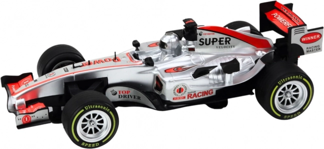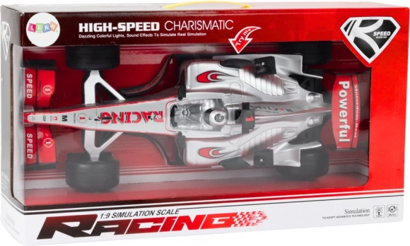 Geniet van actievol rijden met de zilveren racewagen op schaal 1:9. Bij het bewegen van het hoofd van de bestuurder worden automatisch de koplampen en realistische sportautogeluiden geactiveerd, waardoor elke rit nog leuker wordt. Het pull-back mechanisme zorgt voor een snelle start zonder batterijen in de aandrijving: indrukken, loslaten en de auto schiet naar voren.