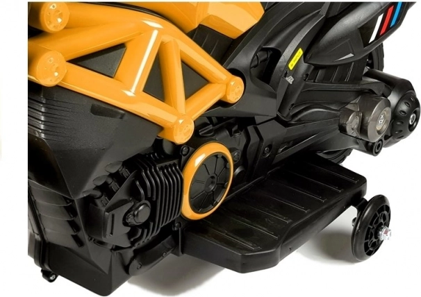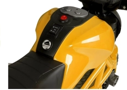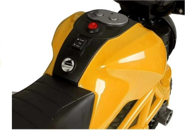 Compacte kinderaccumotor GTM1188 in het geel biedt stabiel rijden, een realistische look en eenvoudige bediening. Hij heeft een stevige behuizing, geïntegreerde zijstabilisatiewieltjes, achteruit en neutraal, en een voorste LED-koplamp met wisselende kleuren. De stille 35 W motor drijft het achterwiel aan en de motor rijdt tot 3 km/u. Ideaal voor kinderen vanaf 3 jaar tot 25 kg, met CE-certificering voor veilig spelen.