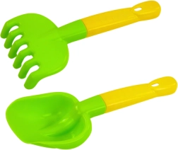 De set bevat een kinderschepje en harkjes met afgeronde randen, die ideaal zijn voor kleine handen en veilig voor kinderen.