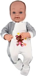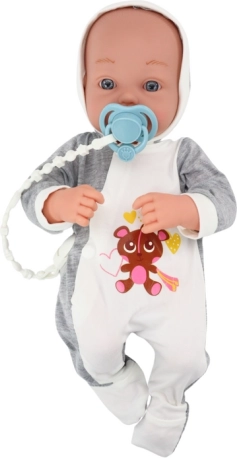 De set bevat ook een blauwe speen aan een gebreid koord en een zacht dekentje voor nog meer plezier in de zorg. Spelen met de pop prikkelt de verbeelding van kinderen en leert hen hoe ze voor een baby moeten zorgen, wat hun sociale ontwikkeling stimuleert.