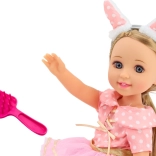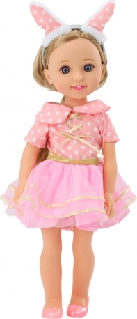 Elegante roze jurk, versierd met witte stippen en gouden accessoires, maakt deze pop tot de perfecte keuze voor elke gelegenheid. De toegevoegde roze schoentjes passen perfect bij de outfit.