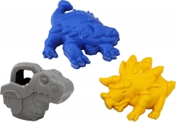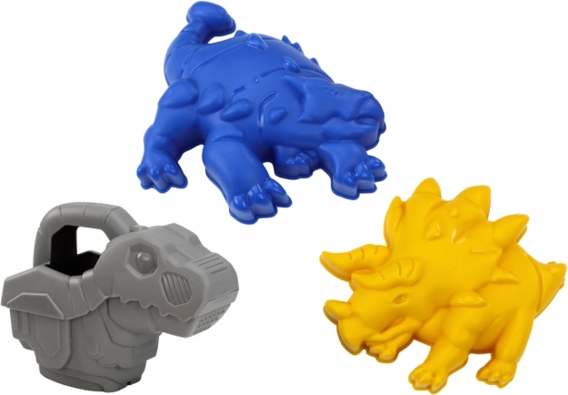 De dinosaurus-gieter nodigt uit tot waterspelletjes en de vormpjes (bv. triceratops) inspireren tot het maken van thematische zandswereldjes.