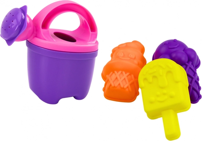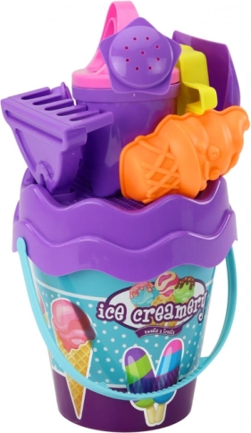 De zandset met een emmer met ijsjesthema is een geweldige keuze voor kinderen die van creatieve spelletjes op het strand en in de zandbak houden. Het centrale element van de set is een paarse emmer, versierd met een ijsjesmotief.