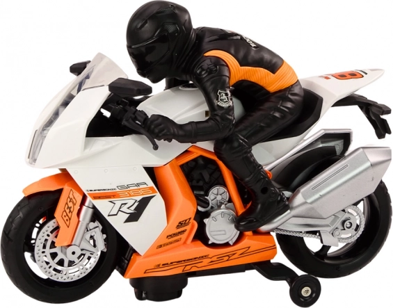 De witte motor met motorrijder is een dynamisch speelgoed, gemaakt van stevige materialen die duurzaamheid en een realistische uitstraling garanderen. Elk stuk is zorgvuldig vervaardigd met veel aandacht voor detail, wat de motor authenticiteit geeft en hem doet lijken op een echte. De witte kleur met oranje accenten is opvallend en geeft hem een modern en energiek karakter. De zorgvuldig gereproduceerde figuur van de motorrijder op de motor zorgt voor een realistische look.