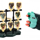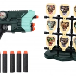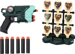 Schietset met dinosaurusmotief, ontworpen voor kinderen, die een unieke spelervaring biedt waarin plezier en ontwikkeling van vaardigheden worden gecombineerd. De set bevat een licht en ergonomisch pistool dat eenvoudig te hanteren is, ook voor kleinere handen.