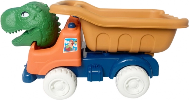 .De speelgoedset voor in het zand met dinomotief is een geweldige keuze voor kleine liefhebbers van prehistorische wezens. Het hoofdonderdeel van de set is een kiepwagen waarvan de voorkant is versierd met de kop van een groene dinosaurus, wat het spel een uniek karakter geeft en de aandacht van het kind trekt.