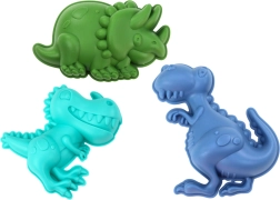 Vier verschillende vormpjes in de vorm van dinosaurussen inspireren tot het maken van scènes en figuren van zand en prikkelen de fantasie.