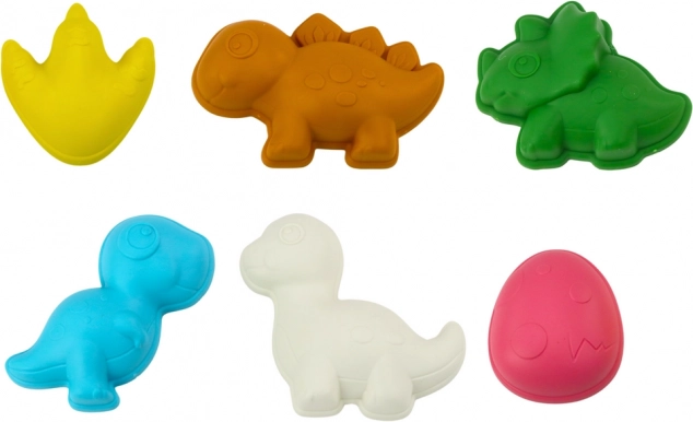 Bonte vormpjes in de vorm van dinosaurussen, eieren en voetafdrukken zorgen voor afwisselende afdrukken en originele zandcreaties.