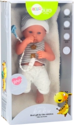 Deze realistische pop in een zachte wit‑grijze outfit valt op door de gedetailleerde gelaatstrekken en prettige accessoires. Dankzij de beweegbare ledematen genieten kinderen van interactief spel, verschonen en in slaap wiegen onder het zachte dekentje. Ook inbegrepen is een speen aan een koord die niet kwijtraakt.