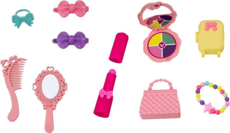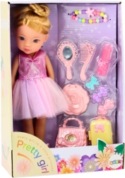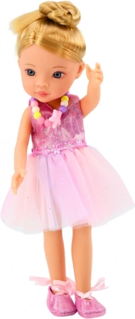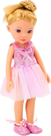 De pop draagt een elegante roze balletjurk die glinstert en de aandacht trekt. Aan haar voeten heeft ze klassieke balletschoentjes die om het been zijn gestrikt en haar de authentieke look van een echte ballerina geven. De pop heeft lang blond haar in een hoge knot, wat haar balletsstijl benadrukt. Ze heeft subtiele make-up en een kleurrijke ketting, die haar charme en elegantie geven. Bij de pop horen een stijlvolle handtas, ideaal voor haar kleine accessoires. Een functioneel koffertje dat de pop kan meenemen op haar balletreizen. Haarspeldjes die kunnen worden gebruikt om het kapsel van de pop te stylen. Een ringetje dat de pop een vleugje elegantie geeft. Een spiegeltje, een borstel en een handspiegel waarmee de pop haar uiterlijk kan controleren voor het balletoptreden.