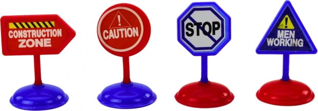 De set bevat 4 educatieve verkeersborden die een bouwplaatsomgeving simuleren en verkeersveiligheid leren.
