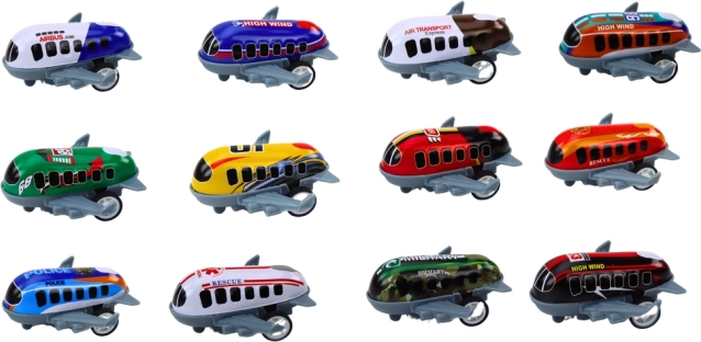 Geniet van urenlange creativiteit en plezier met deze set van 12 speelgoed in de vorm van vliegtuigen. Elk model is uitgerust met aandrijving en wielen voor rollenspelen. Kleurrijke vliegtuigen met opschriften zoals "High Wind" en "Air Transport" inspireren de verbeelding van kinderen.