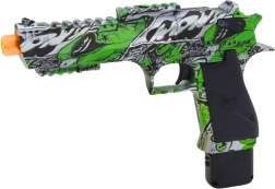 Het pistool valt op door zijn dynamische kleurstelling: intens groen voor een energieke en aantrekkelijke look. Daarnaast is het voorzien van zilverkleurige accenten voor een futuristische, moderne uitstraling. Het ontwerp is verder verfraaid met graffiti-details die een urban karakter en unieke stijl geven, zodat het meteen in het oog springt en zich onderscheidt van andere speelgoedartikelen.
