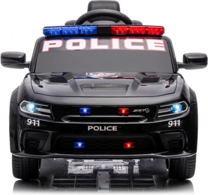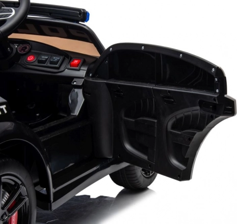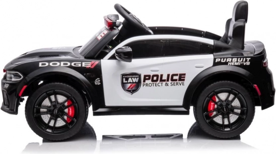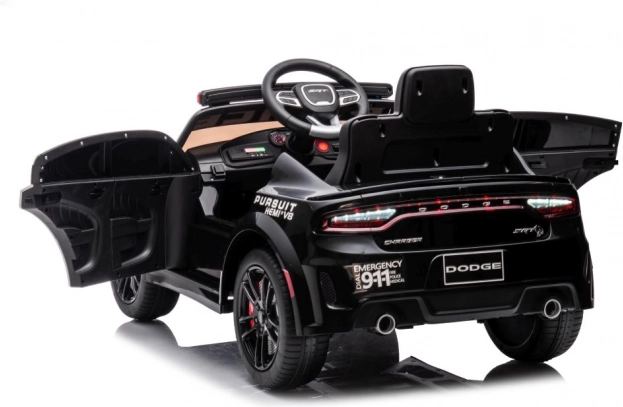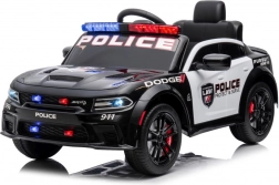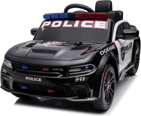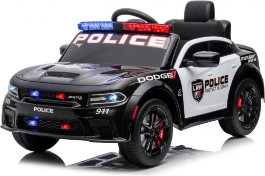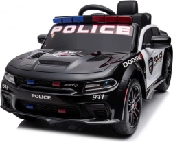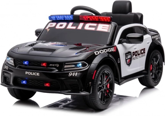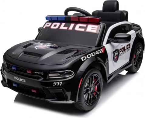 Stijlvolle elektrische kinderauto in de stijl van een politie DODGE Charger verrukt met LED-zwaailichten, openslaande deuren en een realistisch interieur. Een geweldige accu-aangedreven wagen voor speels rijden en politiepret.