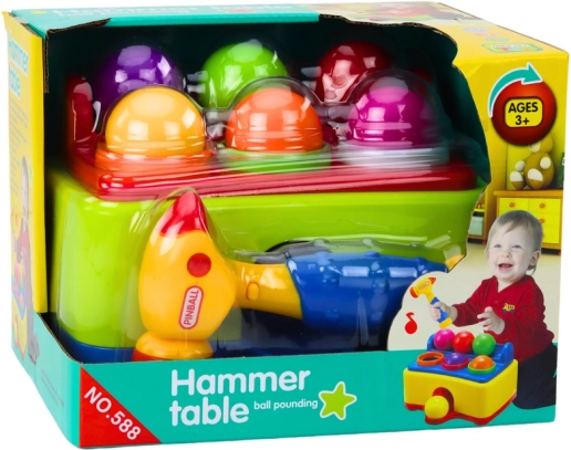 De set bevat een tafel met gaten, 6 kleurrijke knikkers en een geluids-hamertje. Ideaal als cadeau, voldoet aan CE- en EN71-normen.