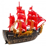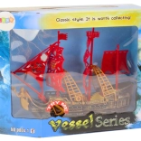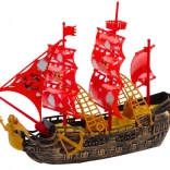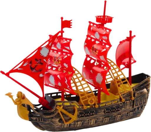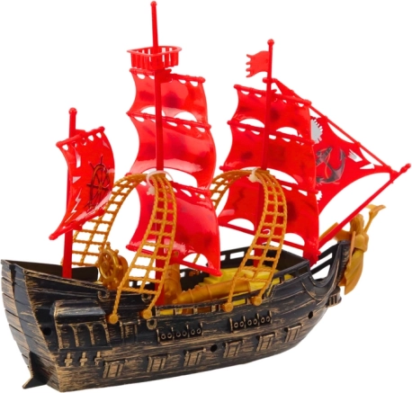 De boot valt op door zijn goudbruine zijkant, wat hem een elegante en authentieke uitstraling geeft, waardig aan echte piratenschepen uit vroegere tijden. Verrijkt met rode masten met wapperende piratenvlaggen, trekt hij de aandacht en versterkt hij de sfeer van mysterieuze zeewaardige avonturen. Dankzij deze details ziet het speelgoed eruit als een echt schip, klaar om zeeën en oceanen te veroveren.