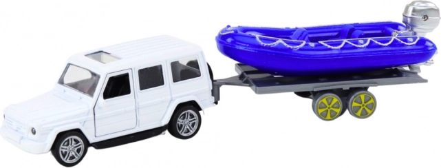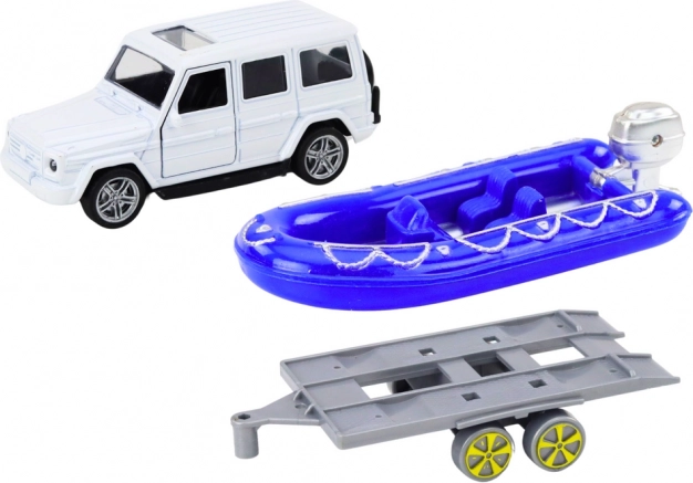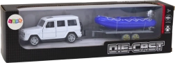 Geniet van spannende avonturen met de terreinwagen en de blauwe motorboot! Dit metalen model biedt precieze details, inclusief openende deuren waar kinderen de figuren van bestuurder en passagiers kunnen plaatsen.