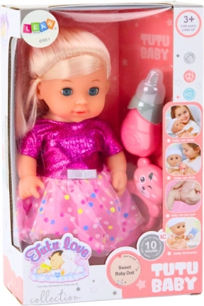 Pop in roze jurkjes met flesje en rammelaar, met geluiden en plasfunctie