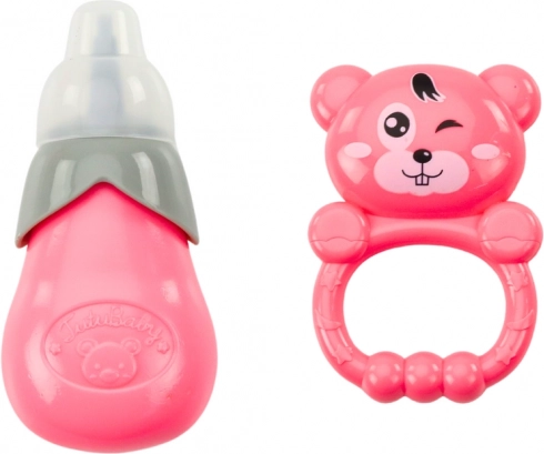 De set bevat een babyflesje dat bij het vullen met water voor "plassen" door de pop zorgt. De rammelaar bevordert de motorische ontwikkeling en coördinatie.