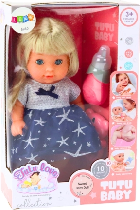 De set bevat ook een babyflesje dat met water gevuld kan worden. Na de voeding kan de pop "plassen", wat kinderen verantwoordelijkheid en zorgzaamheid leert tijdens het ouderschapsspel.