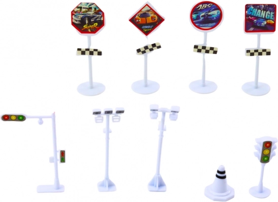 De set bevat ook een set verkeersborden en een mat die een verkeersomgeving simuleert en het spel verrijkt.