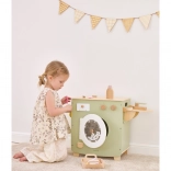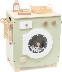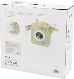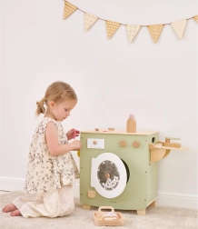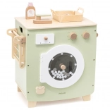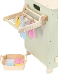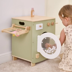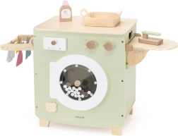 Deze hoogwaardige houten wasmachine in zacht pastelgroen met natuurlijke accenten biedt kinderen een authentieke ervaring van wassen, drogen en strijken. Bedieningknoppen, een doorzichtig deurtje en een zijwaarts inklapbaar droogrek met knijpers zorgen voor urenlang zinvol spel en vaardigheidsontwikkeling.