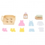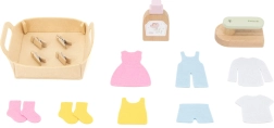 De set bevat ook accessoires zoals wasmiddel, een wasmand, vilten kleertjes en een houten strijkijzer. Dankzij de robuuste houten afwerking en de gladde randen is het speelgoed veilig en duurzaam voor dagelijks spel.