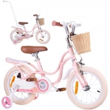Stijlvolle en veilige 14" kinderfiets ROYALBABY Little Swan voor meisjes die net beginnen met fietsen. Biedt stabiliteit dankzij de zijwieltjes, eenvoudige bediening met ergonomisch stuur, een combinatie van voorrem met remklauw en achterste trommelrem voor zeker remmen en een voor mandje voor kleine spulletjes. Inclusief duwstang voor ouders.
