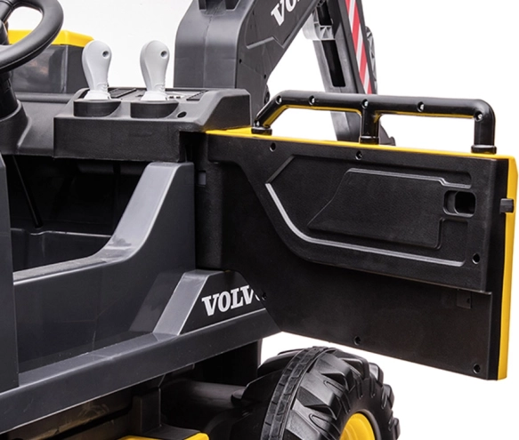Gelicentieerde kindergraver op accu VOLVO met beweegbare arm en bak voor een realistische ervaring met het besturen van een bouwmachine. Uitgerust met 2× motor 12 V 45 W, 12 V 14 Ah accu, bediening van arm en bak, zachte EVA-wielen, vijfpuntsgordels en een ouderlijke 2,4 GHz afstandsbediening voor veilig rijden. Inclusief LED-verlichting en muziekpaneel met FM-radio, USB, MP3 en microSD.