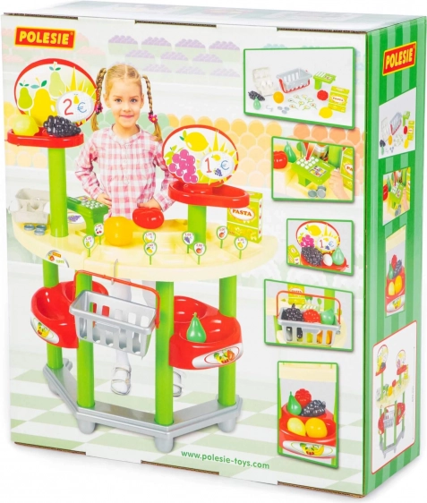 De set bevat verschillende soorten producten, fruit en andere accessoires die kinderen in het mandje en op de schappen plaatsen. Dankzij de opvallende kleuren zijn sorteren en kiezen leuk en overzichtelijk.