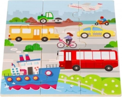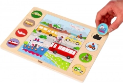 Dankzij het stevige hout en de gladde randen is het spel veilig vanaf 18 maanden. Vrolijke kleuren en duidelijke vormen spreken aan en helpen bij het beter leren kennen van auto’s, bussen, boten, vliegtuigen en andere vervoersmiddelen. Na het voltooien kan het kind de voertuigen benoemen en ze zoeken op de grote afbeelding – een geweldige activiteit voor de taalontwikkeling.