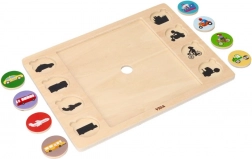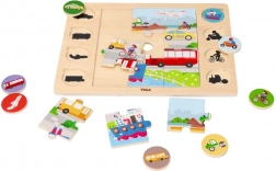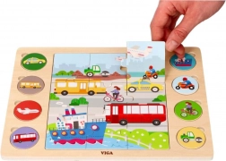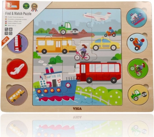 De houten VIGA-puzzelset “Zoek en match – vervoersmiddelen” combineert speelplezier met slim leren. In het midden leg je 9 grote stukjes tot één afbeelding en vervolgens matcht het kind 8 ronde schijfjes met voertuigen aan hun silhouetten op het bord. Het ondersteunt natuurlijk leren door spel en versterkt het zelfvertrouwen bij elke juiste match.