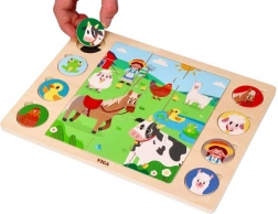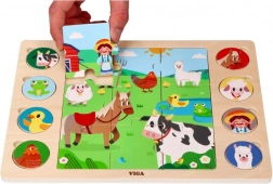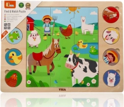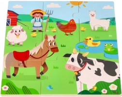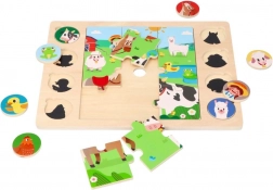 Deze slimme puzzel combineert twee activiteiten: eerst leggen kinderen het middelste plaatje van 9 grote stukken, daarna wijzen ze 8 ronde dierfiches toe aan de corresponderende schaduwen op het bord. Het spel stimuleert op natuurlijke wijze de woordenschat – na het leggen kunnen kinderen de dieren benoemen en ze zoeken op de grote boerderijafbeelding.