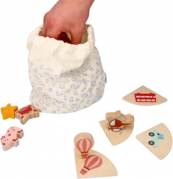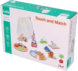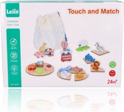 Dit houten “Touch & Match”-spel van LELIN leert kinderen vormen en afbeeldingen herkennen via de tast. Kleurrijke houten stukjes met dieren-, vervoers- en objectmotieven worden gekoppeld aan bijpassende onderleggers, terwijl het kind het juiste stukje op de tast zoekt in het stoffen zakje.