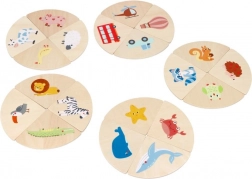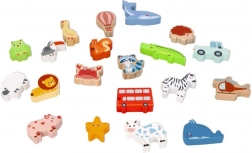 Duurzame houten vormen met dieren, voertuigen en voorwerpen motiveren tot leren en vrij spel. Gladde randen zijn veilig voor kleine handjes.