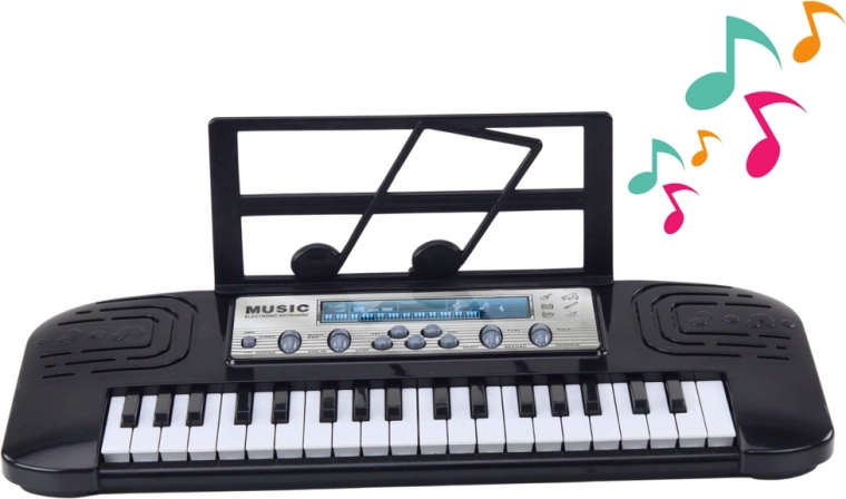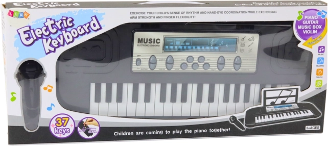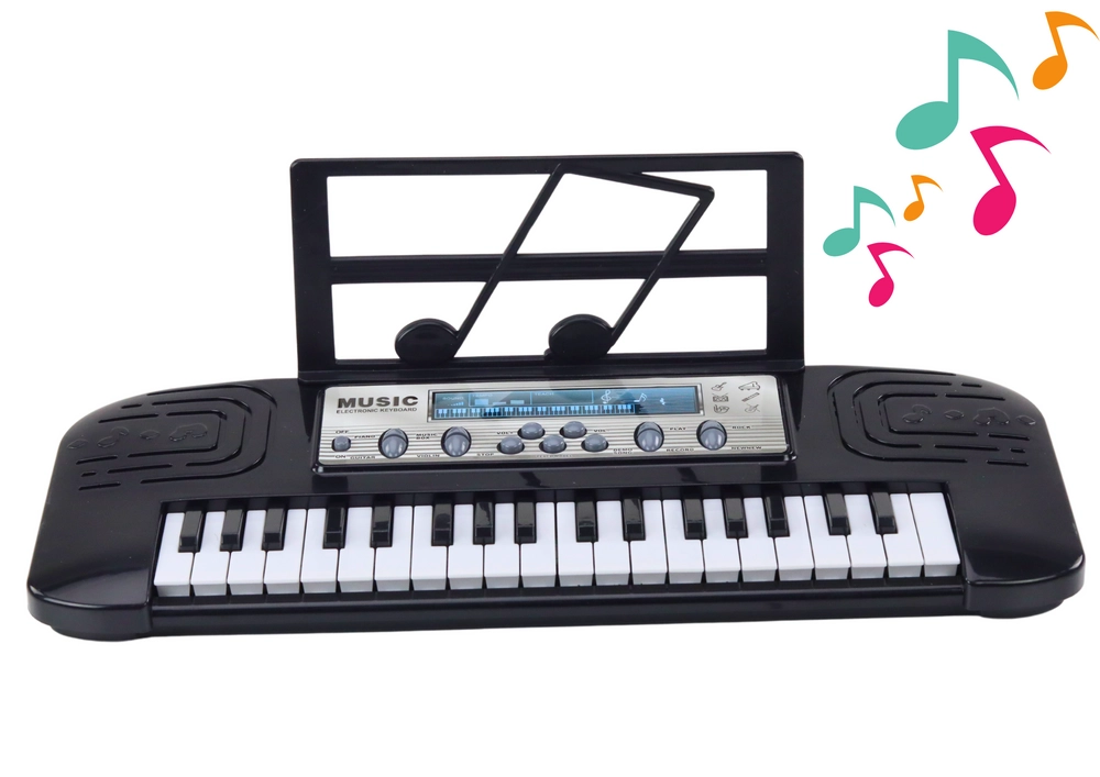 Elektrische piano voor kinderen in elegante zwarte kleur met 37 toetsen, microfoon en lessenaar biedt uren plezier en leren. Ondersteunt de muzikale ontwikkeling, creativiteit en zelfvertrouwen bij optredens dankzij functies die piano, gitaar, speeldoos en viool nabootsen.