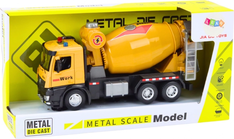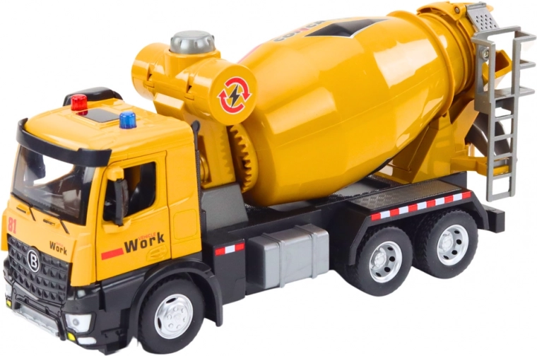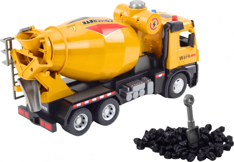 Onze gele betonmixer met bewegende onderdelen en frictie-aandrijving is de beste keuze voor alle kleine bouwliefhebbers.