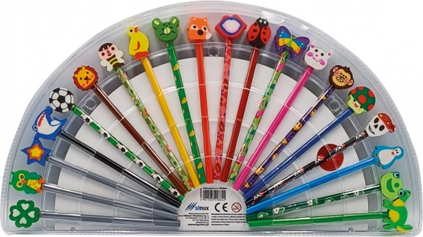 Ontdek een geweldige set voor kinderen die zowel de fantasie als de fijne motoriek stimuleert. De potloden zijn versierd met vrolijke patronen en elk potlood heeft aan het uiteinde een praktische gum in verschillende vormen – zo kun je kleine foutjes tijdens het tekenen eenvoudig corrigeren.