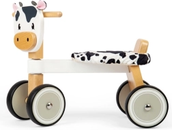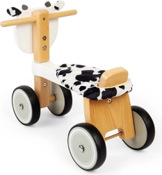 De loopfiets heeft een leuk ontwerp in de vorm van een koe, wat de kinderfantasie en verbeelding stimuleert.