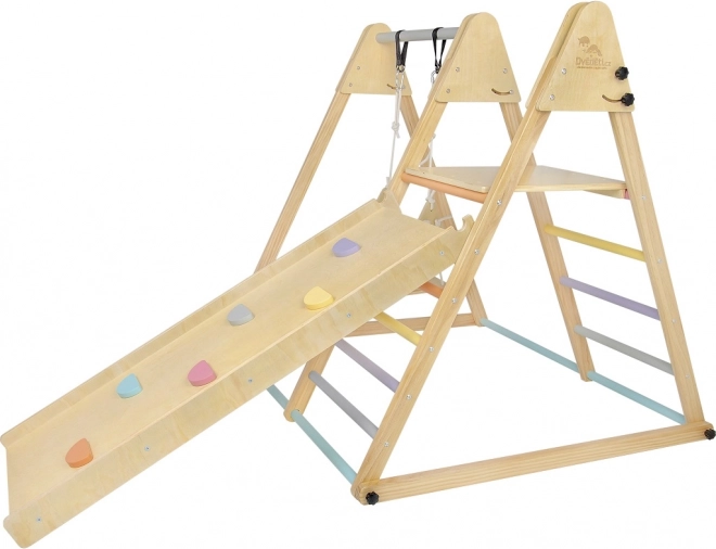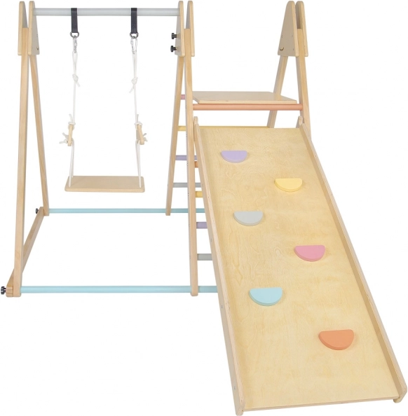 Montage is vereist en er is een gedetailleerde handleiding inbegrepen in de talen CZ, SK en EN. De set is uitgerust met een schommel, klimrek en glijbaan met pastelgekleurde grepen voor maximaal speelplezier.