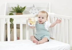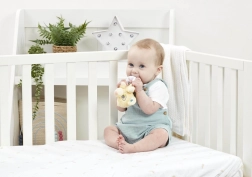 Het gedempte geluid van de rammelaar trekt de aandacht zonder het gevoelige gehoor van de baby te overprikkelen.