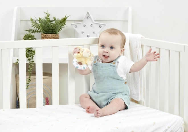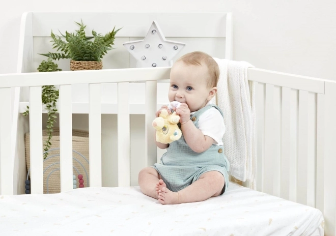 Zachte plush, natuurlijke kleurtonen en een compact formaat maken de rammelaar tot het ideale eerste speeltje.