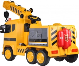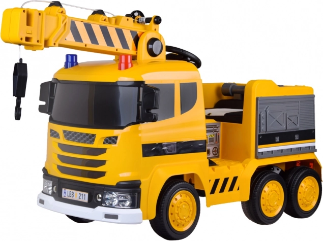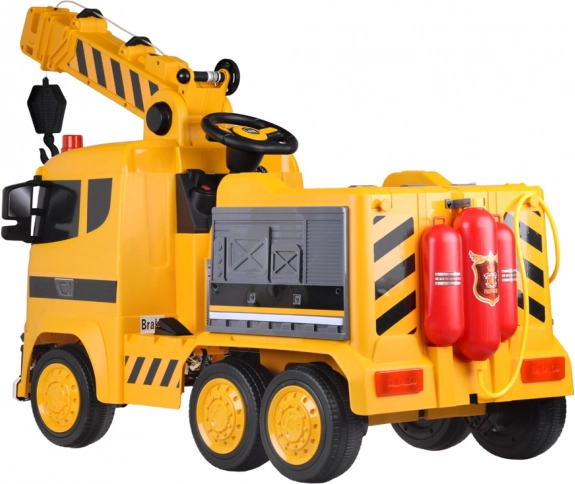 Deze elektrische kraanauto bezorgt iedere kleine bouwer veel plezier. De realistische beweegbare arm met lier en haak wordt bediend met een hendel op het dashboard, de kabel kan met een handmatige slinger worden op- en afgerold. Na het starten klinkt motorgeluid en gaan kleurrijke knipperlichten op de zwaailichten en carrosserie branden. Besturen is eenvoudig dankzij het gaspedaal en de rem; het voertuig stopt ook zodra je het gas loslaat.