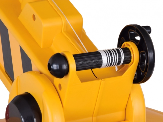 De kraan heeft een functionele arm bediend met een hendel en een lier met slinger om lasten op te tillen en te laten zakken – realistisch spelen zoals op de bouw.